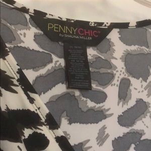 This leopard print dress has the appearance of a wrap dress but is not an actual wrap. It has a funky animal type print and is very versatile. It is extremely comfortable and flattering. It is from the brand PennyChic and has only been worn one time to an event. Perfect condition.
