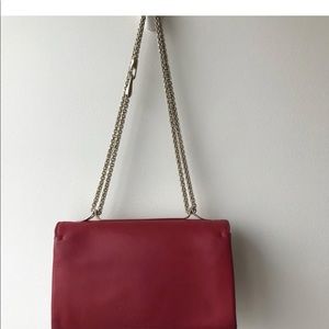 Classic red Valentino clutch in lambskin! Comes in silver tone hardware, a detachable chain link strap, and a single exterior hand strap at front face with the classic studs.