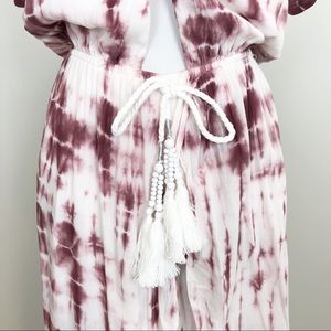 Airy swim cover up with cutout front detail. Short sleeves. Elasticized waist. Tie with Tassel. High double front slits. Burgundy pink color combo.
