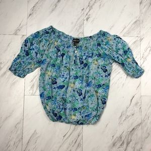 This is an adorable blue floral print top by Wet Seal. It has an elastic band at the waist so you can make this into a shorter mid drift or longer to meet your shorts or jeans. The neckline is elastic and can be worn as a scoop neck or off the shoulder.