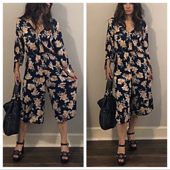 Floral chic stylish jumper Modeling size small measurements Bust laying flat on one side S 19 M 20 L 21 waist un stretched elastic S 12.5 M 13.5 L 14.5 hips S 21 M 22 L 23 Total Length S 44.5 M 45 L 45.5 pants part is fully lined