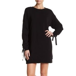 Ruched sleeves add a trendy detail to this simple French Terry sweater dress.