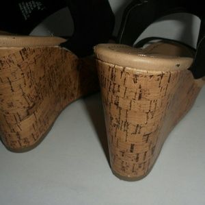 Size 7 1/2 cork wedges, not real cork though. Black ankle strap with elastic in the back so no need to buckle or unbuckle every time. These look great with summer or spring dresses or even jeans. A great staple to every woman's closet! A few small scuffs on them but not even noticeable! Check out the pictures. Prices are negotiable so make me an offer!