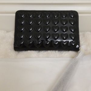 Brand new Details Heart accents cover this sweet patent leather smartphone wallet. - Zip-around closure - Exterior features allover leather construction - Interior features 6 card slots, zip and wall pockets, and 2 slip pockets - Approx. 4" H x 6" W x 1" D - Imported Materials Leather, PU coating exterior, textile lining