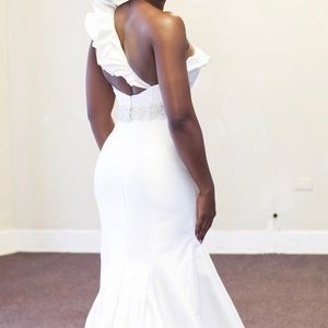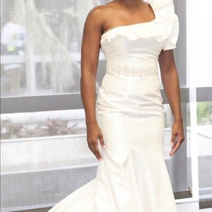 This Romona Keveza One Shoulder Fit & Flare Gown is a beautiful modern & classic wedding dress. It has a ruffled neckline that extends up one shoulder. Princess seams give the gown a fitted tailored look. Dress comes with a simple dupioni silk belt with the buckle wrapped in the same fabric. This gown has been worn once & is in great condition. Belt included.