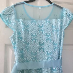 Girly blue short sleeve dress with printed flowers. Ribbon sash belt. Rhinestones and embroidery at the neckline. Dress is lined. Seller welcomes additional questions.