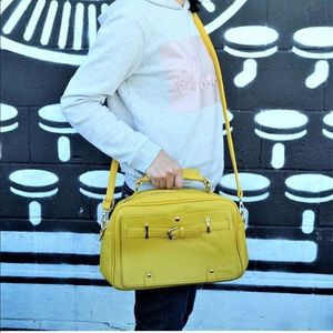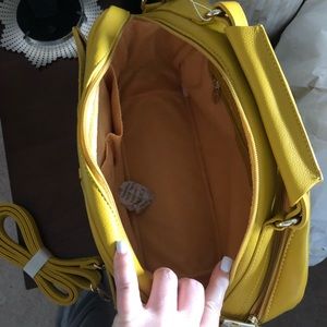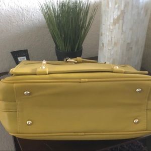 BRAND NEW WITH TAGS!! Super soft boxy Mustard Yellow color satchel with top handle that has a drop of 4.5”, front pocket with snap closure, two zipper entries into the bag with 2 pockets inside and one zip closure on the other. PU leather. Sueded material interior. Includes 24” adjustable crossbody strap. Has footed bottom and gleaming gold hardware. Multifunctional for everyday or evening. Perfect size: 8.5”H x 12.5”W x 4.5”D