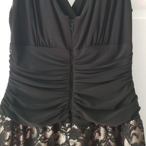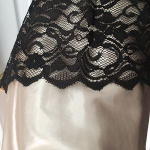Gorgeous black dress with V-Neck front and back with zipper closure in the back. Beautiful taupe satin under black lace. Worn once.