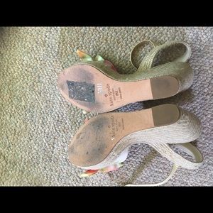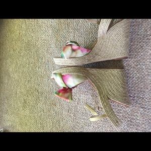 Platform wedge featuring braid-wrapped midsole and striped toe strap with bow