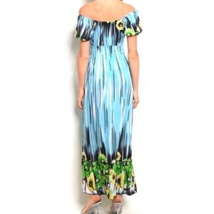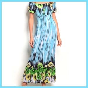 ⚡️FLORAL OFF THE SHOULDER MAXI DRESS. SO FIGURE FLATTERING. BLUE, GREEN, BLACK & WHITE. THE TOP HAS STRING PULLS THAT CAN CINCH IN TO MAKE THE BUSTLINE A LITTLE LOWER CUT. 98% POLYESTER AND 2% SPANDEX. US BOUTIQUE CLOTHING AND IN US SIZING. TRUE TO SIZE. GORGEOUS PRINT. DRESSY OR CASUAL. LONG SKIRT. SHORTER TOP. SHORT SLEEVES. PROM HOMECOMING. COCKTAIL. CUTOUT. PLEATED. SHIFT. MOODY FLORAL DRESS. SHEATH. AVAILABLE IN M-L. REASONABLE OFFERS ALWAYS CONSIDERED AND BUNDLE AND SAVE.