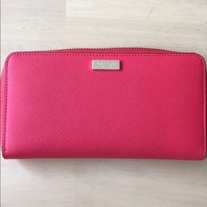 Spacious Kate Spade wallet with plenty of compartments for cards and money. Looks red in pictures but is more like a bright coral. Lightly used - like new!