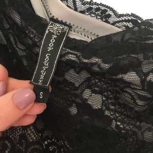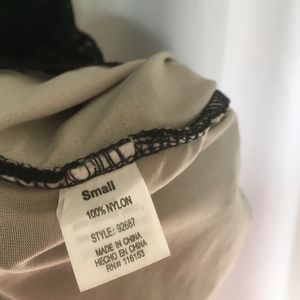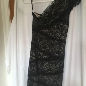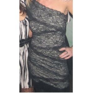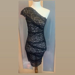 Vintage lace bodycon dress, one-shoulder, nude backing with black lace over it. Size small, from Poof Couture. Very cute on! I think I only wore it once, so it is in excellent used condition. Perfect for cocktails or a fancy evening out.