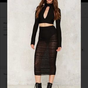 It's ruche hour. The Icaria Skirt by BOSSA comes in sheer black and features a bodycon midi silhouette, control waist, black panty lining, and ruching at sides. California Residents: Proposition 65. Color: black