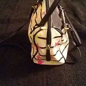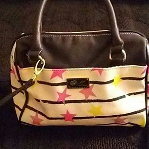 Really cute betsey Johnson black, pink, white gold hardware star purse. One pocket on outside of purse. Interior stripes with lip print.