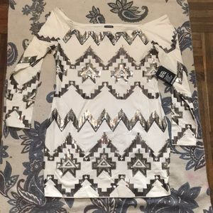 NWT. Never worn. Planned to get it altered, just never did it. White stretchy dress with Sequin Aztec type pattern.