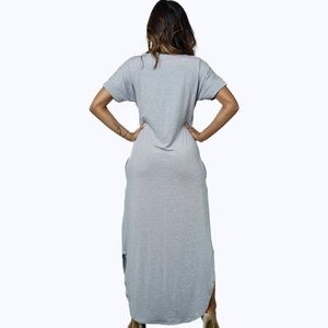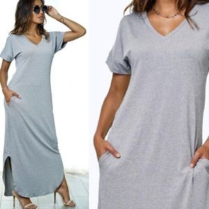 This maxi shift dress features v-neck, short sleeve, hem round trim, two side slit. Bust measures about 39 inches, length measures about 52 inches Model Info: Height: 5ft 5in | Waist: 24in | Hips: 28in | Chest: 32C Wear Size: Medium