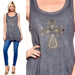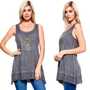 U neck Tunic Tank top with Cross Embellishments and Ribbed hem lining. Garment Oil washed. Made in USA. Perfect casual tunic tank for all your Summer fun!!