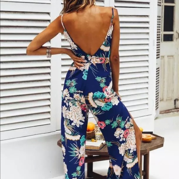 Foxy🍃Blue Floral Sexy Slit Leg Belted Jumpsuit