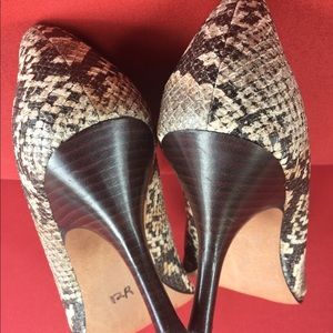 Tahari Snakeprint Pumps with Brown Heels in Excellent Condition. Some peeling inside as shown in the last picture. Heel approx 3”.