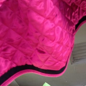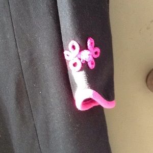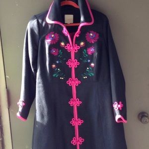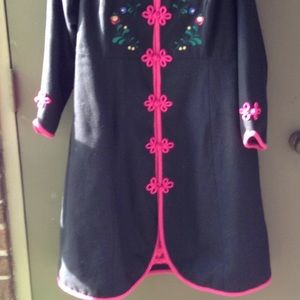Black with pink trim around the hem of the sleeves and down the front of coat the rounded at the bottom and has pink closures. It is embroidered in pink, green, blue and yellow colors. Princess seaming in front and back. Quilted satin pink lining. Sleeves have a curve and the same toggle that is used for closing up the coat. Never wore it is 44 inches long. New Never wore it. FIRM PRICE!!!!!!!!