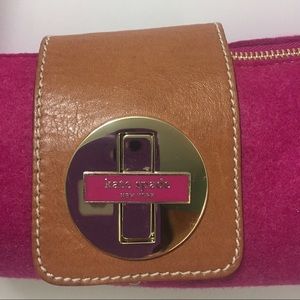 Super cute Kate Spade Bag! Always gets compliments. Magenta colored wool felt with light brown leather closure and strap. Logo embossed turn lock closure. Very clean and in excellent preowned condition. Measures: 10.5” L x 3.5” W x 4” H. Shoulder drop is 7.5”.
