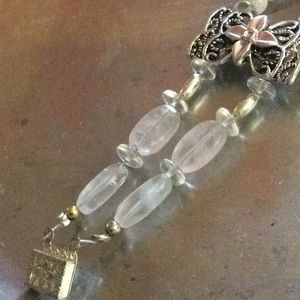 Silver color clasp and beads. Rose quartz, silver color glass and mother of pearl beads. Center beads are lamp work glass. Closed length is 7”.