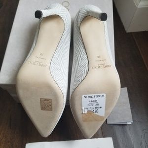 SOLD! classic Romy heel is updated for the new season in a chic latte knit embossed nubuck. Leather lined with a leather sole, the 100mm heel height creates a leg-lengthening effect. Steal the show when wearing these fabulous heels.