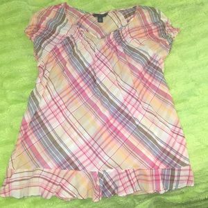 Tommy plaid, gathered, flowy shirt. Very soft material. Gathering on the back as shown in last two pictures.