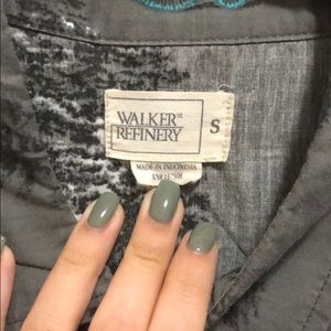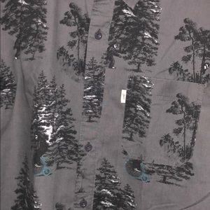 Tree and gorilla prints on grey button up shirt. Long sleeve. One pocket.