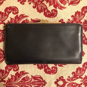 Authentic Vintage Gucci Buttery Leather Long Wallet, Date Code: 034•904•8915, Dark Blue with GG logo gold plated accents, Used condition but very functional. Multiple card slots, accented clasp coin purse attached.