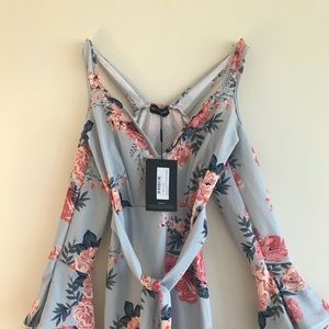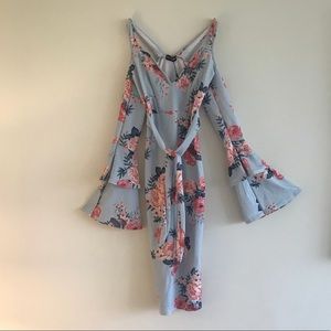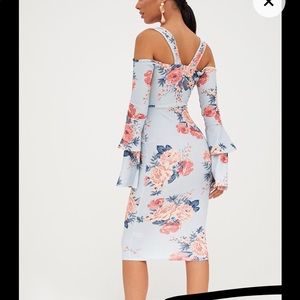 Ice Grey Floral Cold Shoulder Frill Sleeve Midi Dress