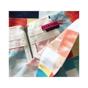 Alice + Olivia Super Flared Pants with an abstract square pattern and back-zip closure in a size 10. Made of cotton + 3% spandex.