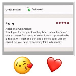 Inside this surprise mystery box you will receive 5 clothing items. All brand new with tags, on trend and super cute! You will have a mix/variety of items including: tops, casual pants, rompers, dresses, skirts and athletic wear. All size Large.