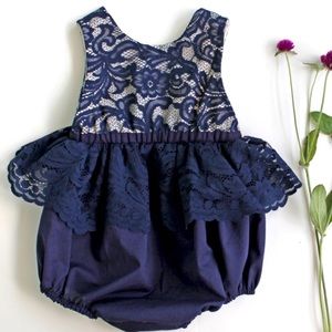 This is a very well made baby romper from a high end online shop. I paid $75 for this, and my daughter wore it once for pictures. Navy blue. The shop is Amanda Archer if you’d like to verify the price. No low balls/price firm