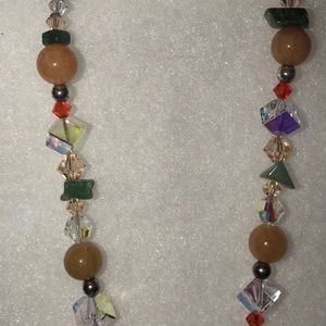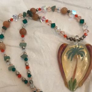 Handmade artisan Lampwork pendant. The pendent has a coconut palm tree design, with a light brown border. The chain is made up of Swarovski crystals, sterling Silver, genuine stones, and pewter. The length is 17”