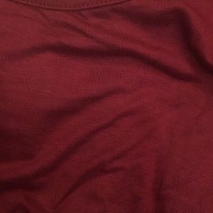 Rounded neck. Trending twisted front knot. 95% Rayon 5% Spandex. Maroon in color. (See last pic for true color)