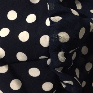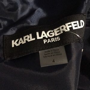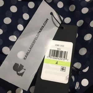 Item # 05235488. Sophistication at its best - Karl Lagerfeld, no need 2 say more. From pit 2 pit 17”. Shoulder 2 hem 34”. Note photos #7 & 8 a small hole on the left shoulder (not noticeable when on) & a slight stain on one of the polka dots purchased this way; due to these issues a huge reduction in price.