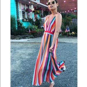 🆕Dorothy Statement Stripes Deep V Maxi Dress New Boutique Item. The Dorothy Dress features a multi-color striped print, deep v neckline, lining, low cut back details with thin spaghetti straps, and hidden back zipper.