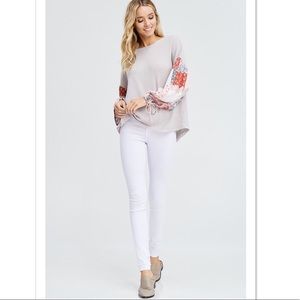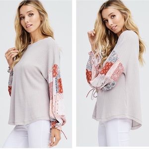 This top is truly unique with the gray waffle knit body contrasted with patchwork printed drop sleeves.
