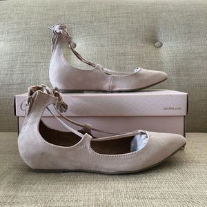 New in box! Faux suede upper. Made made lining. Pointed toes, lace up and zipper closures, padded footbed, and 1 inch hidden wedge.