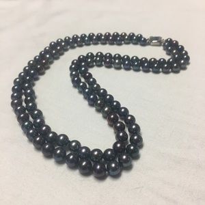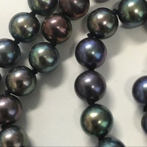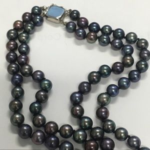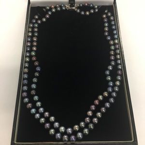 PEARL PARADISE- This stunning double strand necklace is composed of 6.0-7.0mm round, multi-hued black (treated) freshwater pearls. The strands are nested and each pearl is double knotted in silk. The surface of the pearls are virtually clean of any imperfections and have a beautiful luster. Comes in the presentation box shown. Retail: $2,200. Open to reasonable offers.