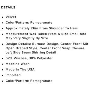 Pomegranate colored burn out looking top. Half wrap with key hole and hidden snap. This is new and never worn. Please ask if you have any questions!
