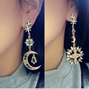 NWT Comes with original Fashion placard with backs. Ethereal stones set in gold tone. Gorgeous chunky space earrings with irregular asymmetrical earrings. Metal zinc alloy, made in China, but great quality. Some imperfections on the enamel. ***Matching Moon or Sun necklace available in other listings!*** Bohemian vintage look costume jewelry metallic shiny festival gypsy hippy hippie wedding fancy formal unique chunky large celestial moonstone moon stone