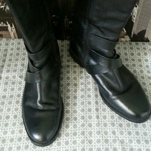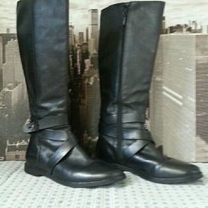 Very gently worn! Black zippered riding boot with strap around the ankle, doubling crisscross at front and fastens on the side. Beautiful condition. Slight wear on heel.