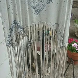 Brand new no tags size medium bust measurements are 17 inches arm pit to arm pit long fringe measures about 15 inches t-shirt comes about 2 inches below belly button more of a cream off white with gray in color purchased at a boutique