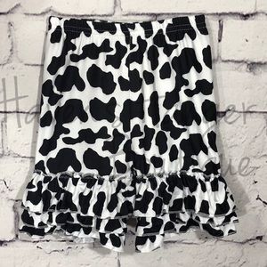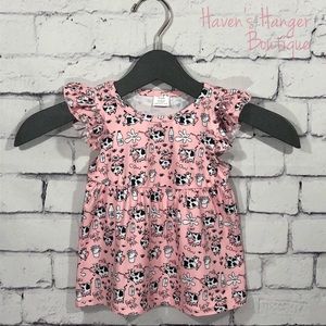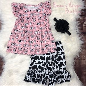 Top and shorts set with cute cow print. Top is pink with cows. Shorts are black and white spotted.