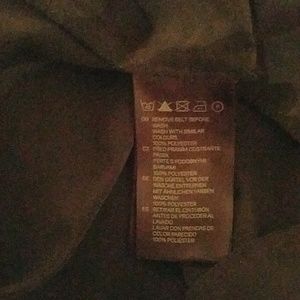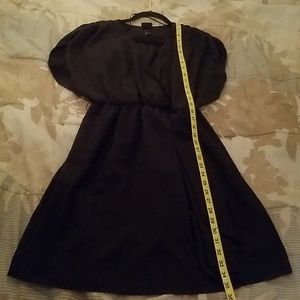 Polyester (but feels silky). Skirt had faux wrap at bottom with ruffle down front (see 4th pic). Elastic waist. Ruching at top of shoulders, wide arm openings. Says size 8, but might fit a 10 (see measurements posted to confirm).