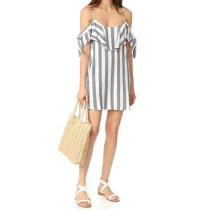Two-tone stripes complement the laid-back look of this loose MISA mini dress. Draped, knotted sleeves. Adjustable spaghetti straps. Unlined.
