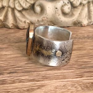 Made by me. Heavy 10 gauge Sterling Silver with 14k bezel and 23.5k Keum-Boo. Center stone is a 14.8ct gorgeous solid natural Yowah opal from Australia. Stone measurements are 23x11x6mm. Total bracelet weight is 92.5g (last photo). Several of the photos were taken outside to show the colors of the Yowah opal when the sun hits it 😊