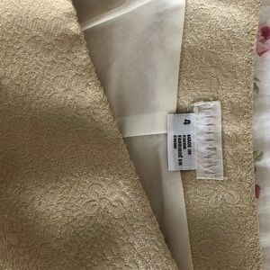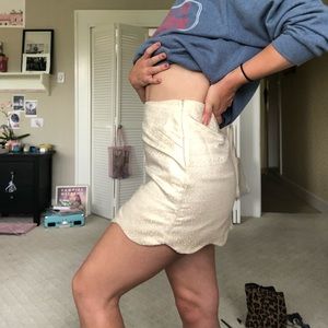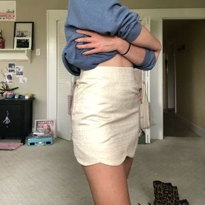 Super adorable cream and gold floral jacquard mini skirt with scallop hem and front pocket detailing. Invisible zipper on side for closure. Great condition